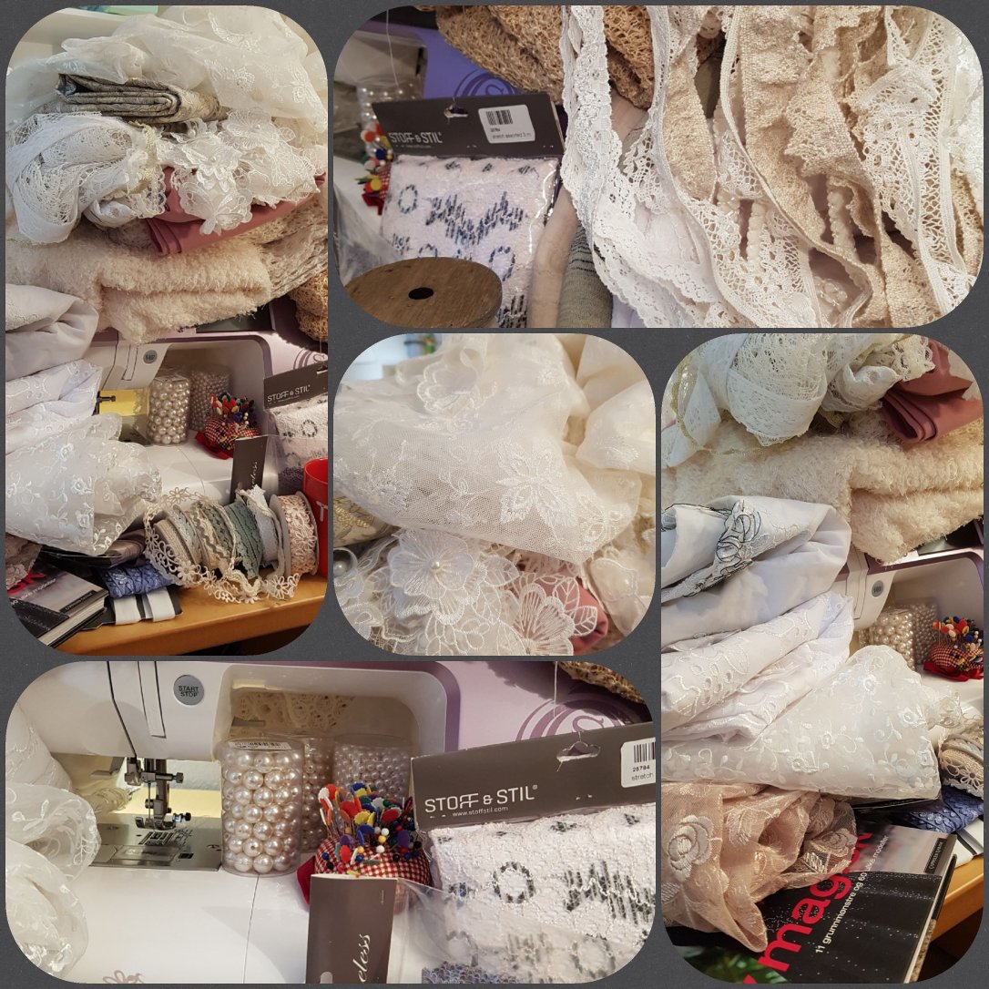 Her er det blonder og mer blonder, stoffer med struktur og effekter, alt i lyse jordfarger med en liten tuch av rosa😍 bånd og perler til den siste finish😉 Nei, det er ikke brudekjole på gang🤞