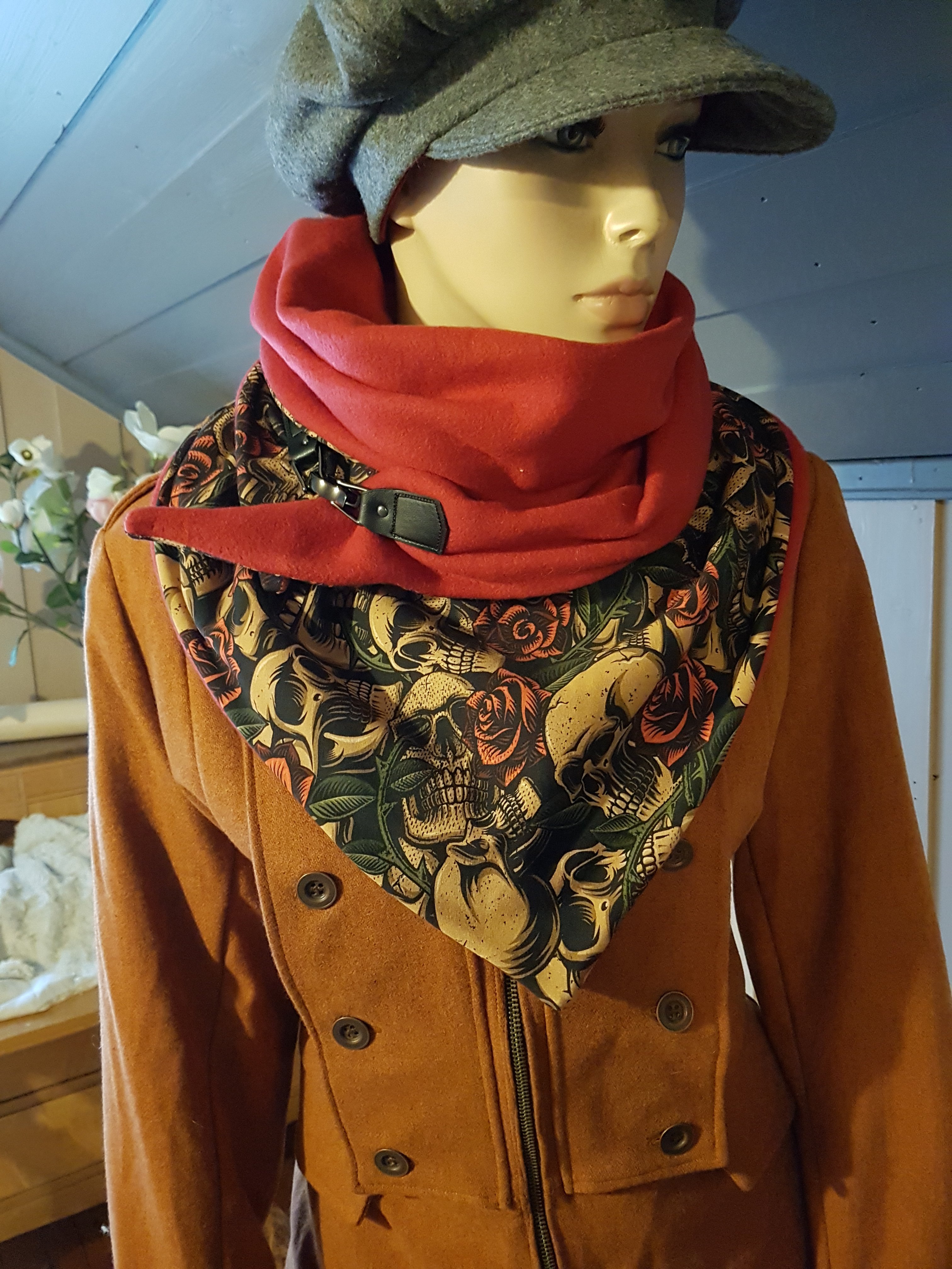 Da jeg har fått mange spørsmål og henvendelser på hvordan jeg lager skjerfene mine, vil jeg her vise bilder og forklare hvordan jeg gjør det. Det er ikke vanskelig å sy, så selv om du er nybegynner kan du fint klare dette. Det er stort så det går med en del stoff. Målet på Skjerfet er 159cm x 58 cm + Sømmonn X 2. (En fremside og en bakside) Duffeldof knapp eller lignende til lukking. (Man kan også lage knapphull eller lage en hempe og sy i knapp.) Litt i forhold til hvilke stoff som brukes og ideen bak designet, er at her er alt lov! Men anbefaler er noe som er godt å ha mot huden på baksiden. Eller som dette på bilde med jersey på forsiden, vil dette fint kunne vendes, og da har du plutselig 2 skjerf i ett.
