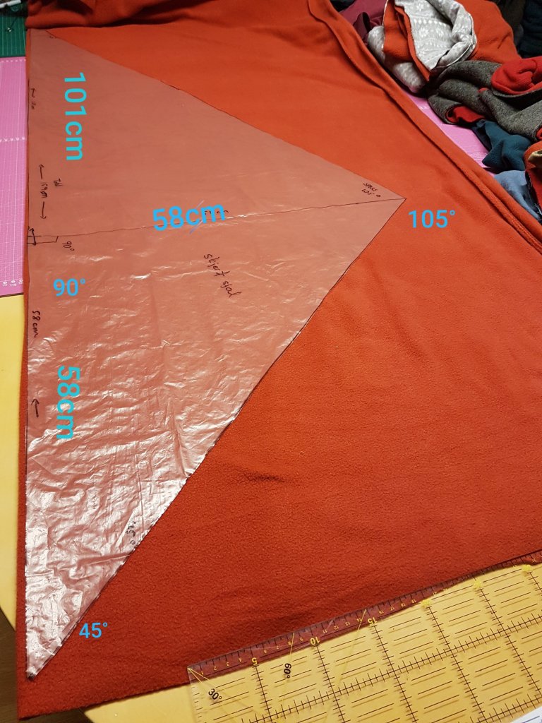 Start med og tegne mønster som vist på bilde. Totalt er lengden på skjerfet 159cm og skal ligge langs trådretningen. Fra ene siden måler du 58cm inn og lager en linje på 58cm rett opp i en 90 grades vinkel. Og da blir spissen 45 grade når du tegner en linje på skrå ned som vist på bilde. Så tegner du en skrå linje fra spissen og ned til den andre enden. Her er det nå 101 cm, så du vil få en mindre vinkel på 30 grader i den siste spissen. du får nå en stum trekant med en lang og en kort side. Fasongen gjør at skjerfet ikke blir så stort og klumpete rundt halsen.