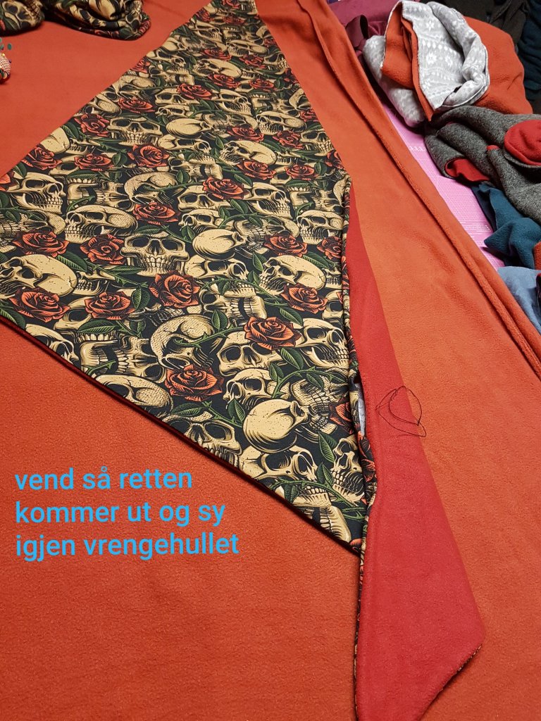Start og sy i spissen foran på skjerfet som vist på bilde og til slutt syr du langsiden sammen. La det være igjen et vrenge hull ca 30 cm inn fra spissen på 45 grader. (Som blir den korteste fliken)