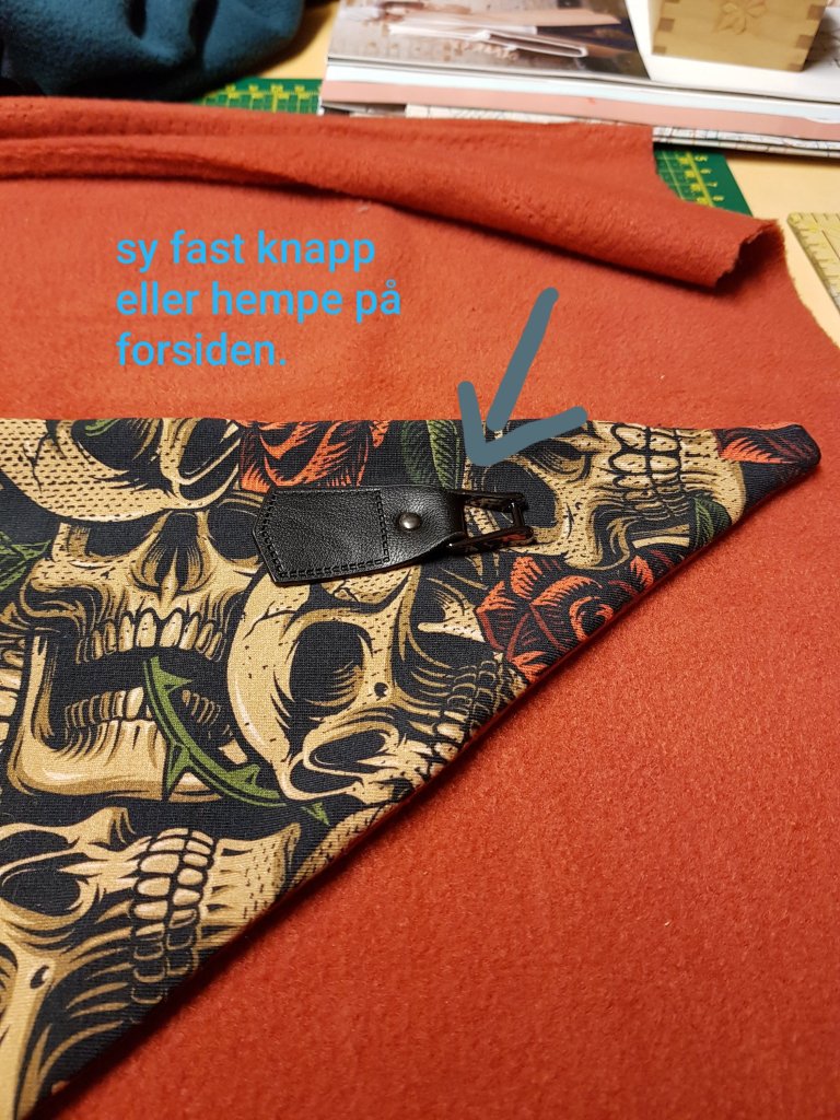Og så syr du delen med krok eller knapp på baksiden av skjerfet på den lange fliken. På stivere stoffer er dette viktig for hvordan det vikles rundt halsen.