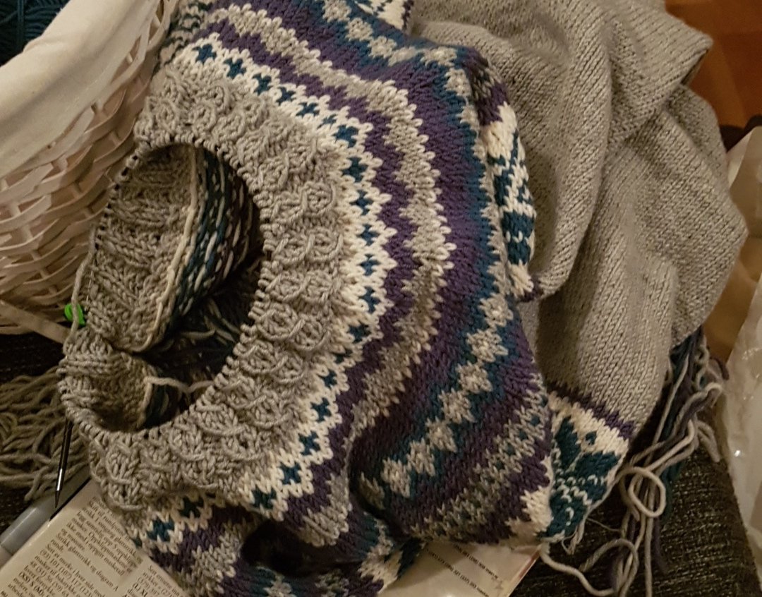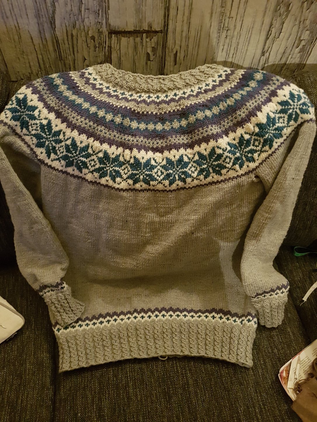 Denne genseren begynte jeg på for over ett år siden. Men nå er den endelig ferdig 😀 falske fletter på vrangbordene og ekstra lengde på bolen. Må ha gensere som går litt ned på rompa😀