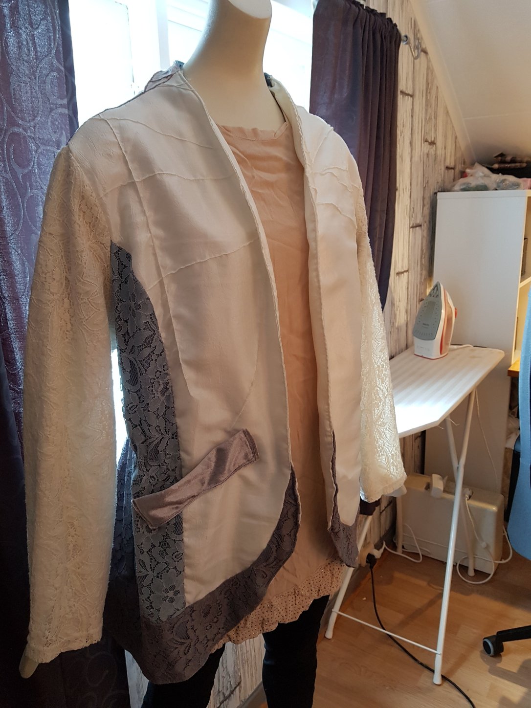 Her er en jakke som jeg har sydd for ett års tid siden.. den er laget ut av ett basismønster og laget min egen vri🙃 armene er fra en kjole som ikke passet lenger så litt redesign og nye stoffer.. sydd effekt sømmer på kryss og tvers for lage litt mer liv i de glatte stoffene.. dukken her er litt liten så ser litt slapp ut på bilde😀
